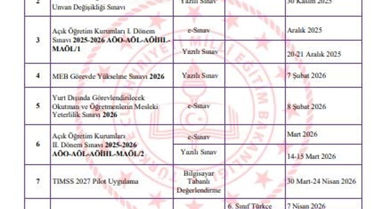 Ayrıca takvimde; gerçekleştirilecek Açık Öğretim Kurumları Sınavları, izleme araştırmaları ile e-Sınav merkezlerinde yapılacak sınavların tarihlerine de yer verildi.