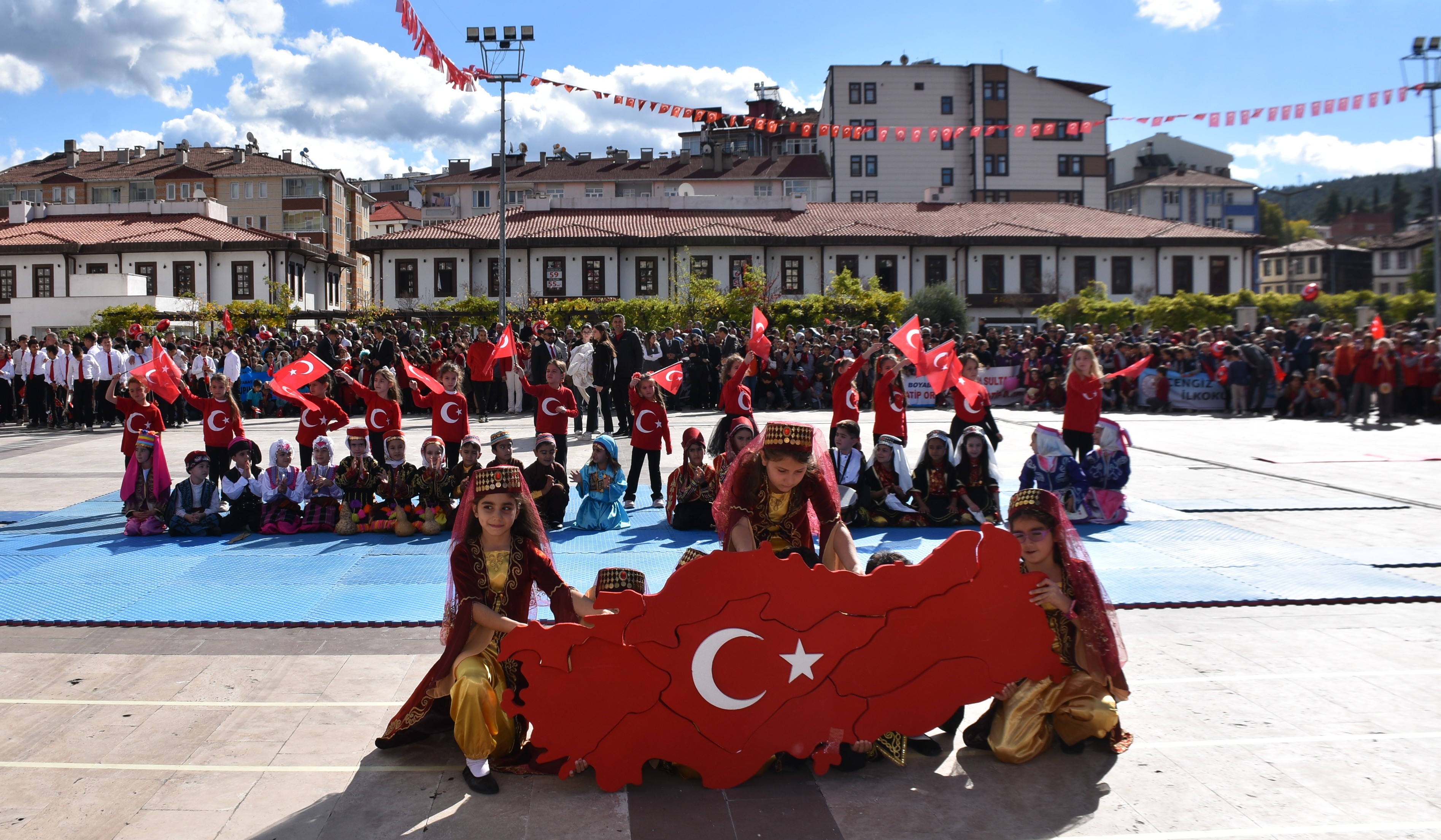 Türkeli'de Huzur Dinçel Stadı'nda yapılan törende, saygı duruşunda bulunuldu ve İstiklal Marşı okundu.
