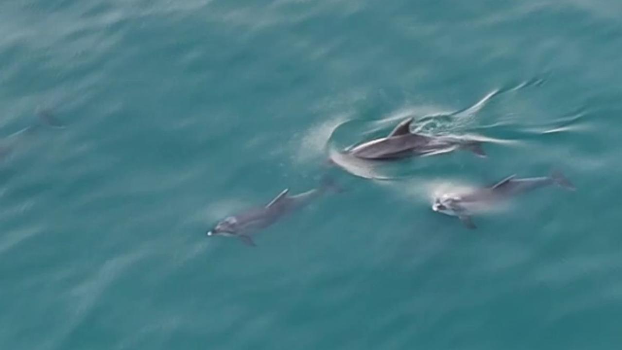 Gerze açıklarında su yüzüne çıkan yunuslar da dronla kaydedildi.