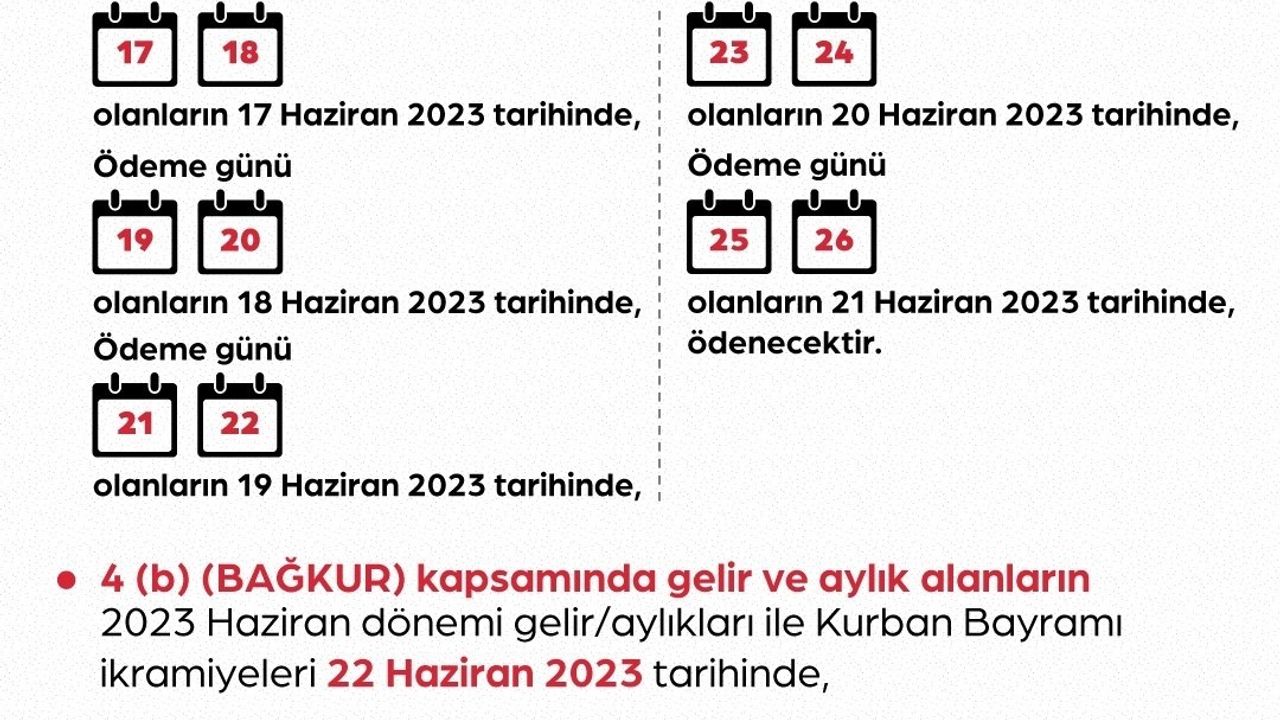 Çalışma ve Sosyal Güvenlik Bakanlığı’ndan yapılan açıklamada, emekli aylıkları ve bayram ikramiyelerinin 17 ile 23 Haziran tarihleri arasında hesaplara yatacağı duyuruldu. Çalışma ve Sosyal Güvenlik Bakanı Vedat Işıkhan da sosyal medya hesabından yaptığı açıklamada, "Emekli aylıkları ve bayram ikramiyesi ödemelerini Kurban Bayramı’ndan önce yapıyoruz. Emeklilerimize ve tüm vatandaşlarımıza hayırlı, bereketli, huzurlu bir bayram diliyorum" dedi.