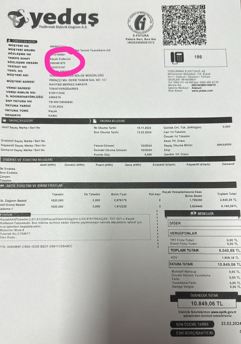 Edinilen bilgilere göre "Usulsüz elektrik tüketildiği" belirlenen türbeler için Vakıflar Tokat Bölge Müdürlüğü’ne yerel elektrik dağıtım şirketi 250 bin TL fatura çıkarttı. Maliye’nin camilerde olduğu gibi türbelerde de bedelini karşıladığı aydınlatma hizmetinin dışında, prizlere elektrikli soba ve klima takılıp usulsüz enerji kullanıldığı tespit edildi.