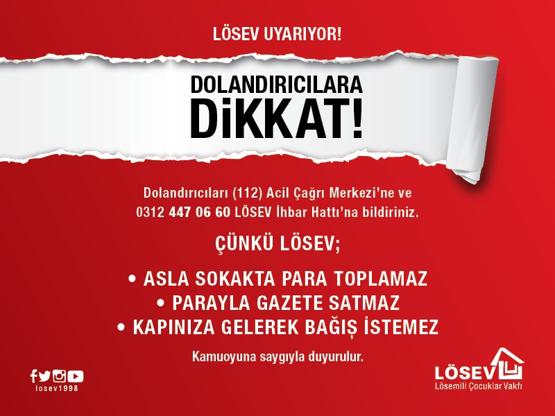 Kötü niyetli kişilerin, LÖSEV’in 27 yıllık güvenilir adını kullanarak duyguları istismar ettiklerini belirten Taşkınsu, “LÖSEV, ülkemizin en denetlenebilir, en şeffaf vakıflarından biridir. Bizim adımıza para isteyen, belge göstermeden bağış talep eden kim olursa olsun lütfen en yakın LÖSEV ofisine veya emniyet birimlerine bildirin” şeklinde konuştu.