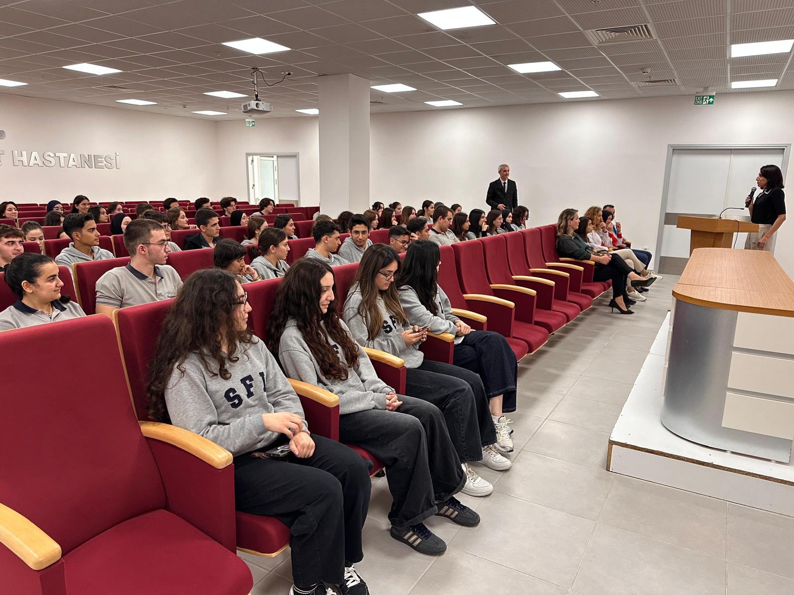 Program kapsamında öğrencileri ağırlayan Başhekim Yardımcısı Uzm. Dr. Merve Tural, hastanenin işleyişi ve sunulan sağlık hizmetleri hakkında genel bilgiler verdi. Öğrencilerin sorularını yanıtlayan Tural, hastane konferans salonunda kısa bir söyleşi gerçekleştirdi.