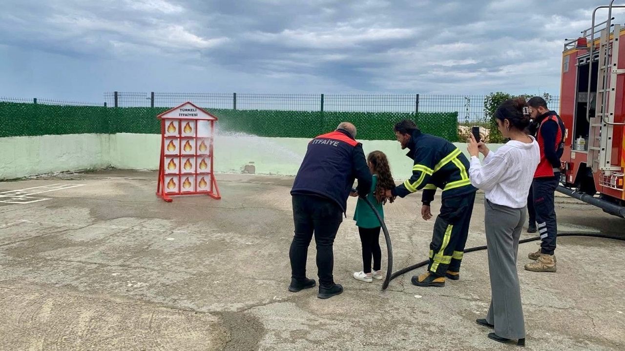 Okul bahçesinde gerçekleştirilen uygulamalı eğitimde ise maket bir ev üzerinde öğrencilere yangın söndürme teknikleri gösterildi.