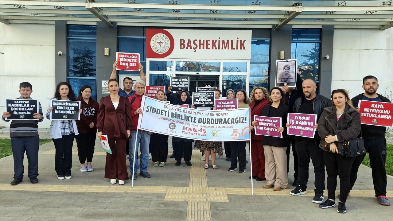 Öz Sağlık-İş Kadın Komitesi Başkanı Fatma Fındık tarafından yapılan açıklamada şu ifadelere yer verildi; “HAK-İŞ Konfederasyonu olarak, 25 Kasım Kadına Yönelik Şiddete Karşı Uluslararası Mücadele Günü vesilesiyle 81 ilde meydanlardayız. Kadınlar ve çocuklar başta olmak üzere dünyanın dört bir yanında zulme, işgale, ayrımcılığa ve her türden şiddete maruz bırakılan masumların sesi olmak için kadın–erkek hep birlikte buradayız.