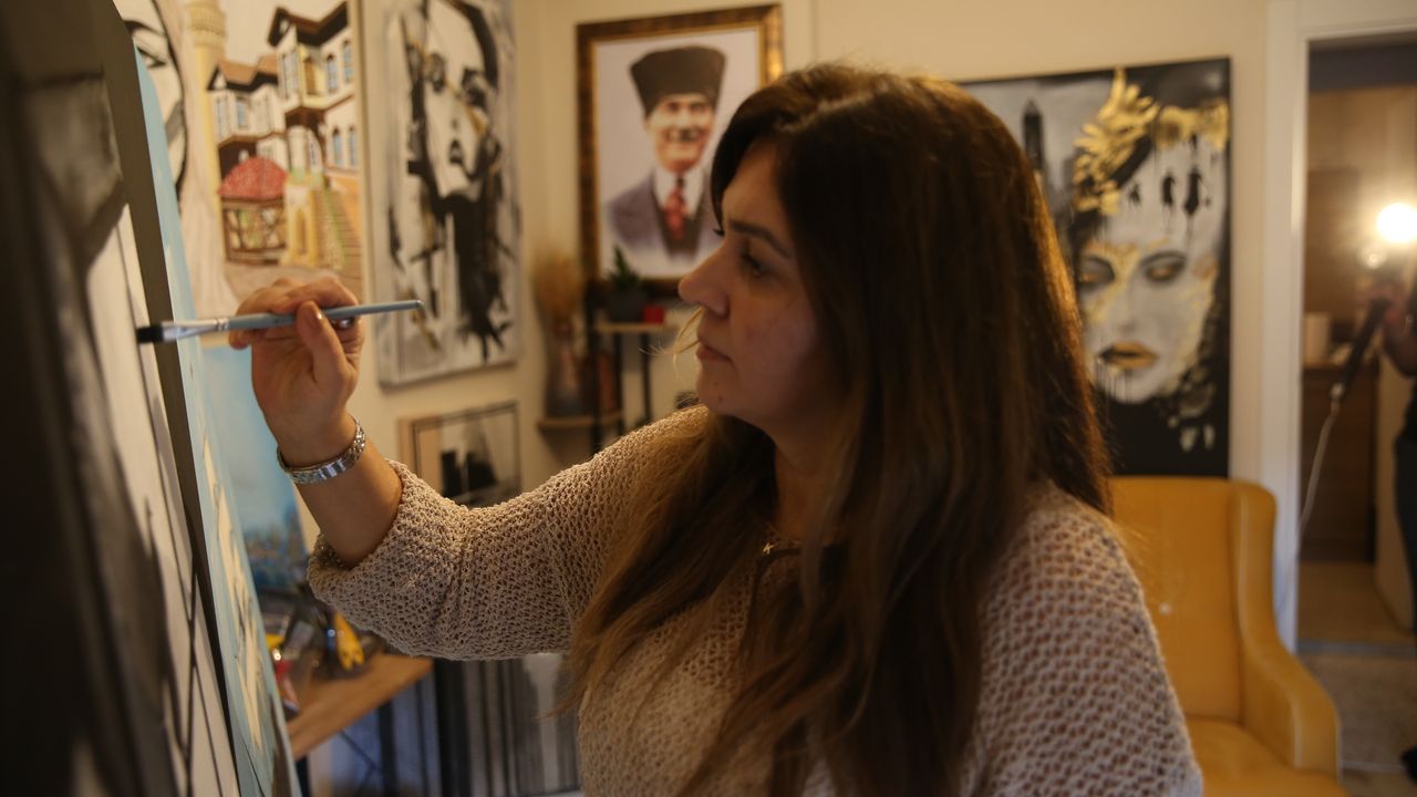 'Ben bir duygu alarak yaptım. Karşımdaki insanların bana benzer duygular aldığına inanıyorum. 'Güçlü Kadınlar' serimizde 8 tablomuz var. Kadınların yaşadığı sorunlar, her şey var. Mutluluğu, üzüntüsü her şeyiyle güçlü kadın. Kafasının içinde karmaşa olan kadınları yaptım. Filistin'de acı çeken, zulme uğrayan kadınları yaptım. Sonrasında orman yangınlarındaki çaresizliği işledim.'