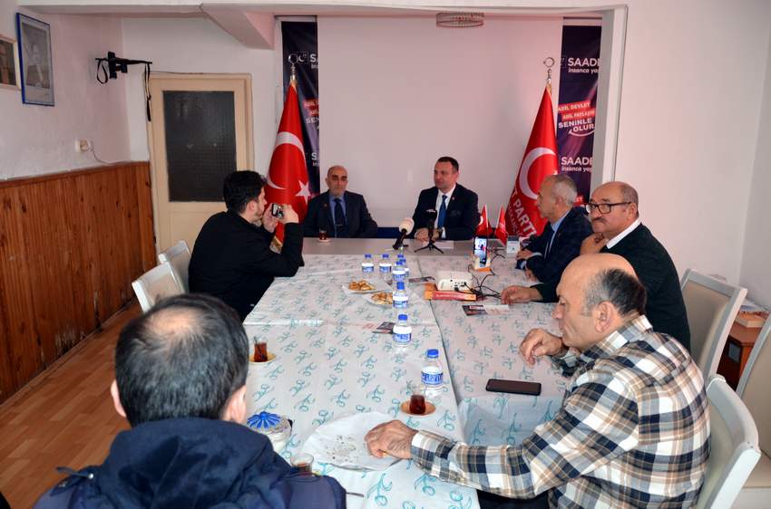 Saadet Partisi İl Başkanlığı binasında düzenlenen basın toplantısına İl Başkanı Cavit Üçüncüoğlu, Belediye Başkan Adayı Barbaros Baltacı ve Seçim Koordinasyon Başkanı Mehmet Ali Yavuz katıldı.