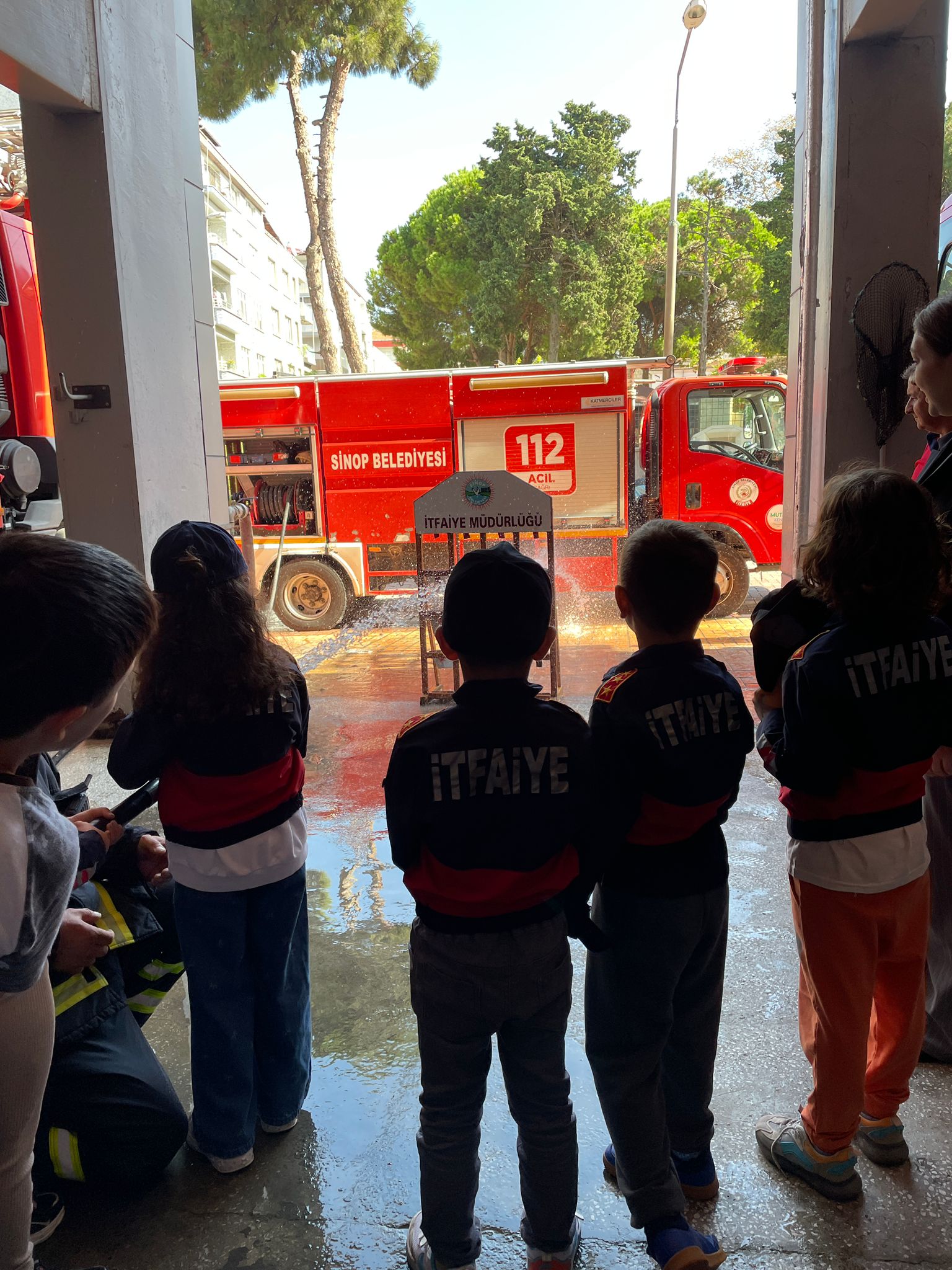 Ziyarette öğrenciler, itfaiye araçlarına binme fırsatı buldu. Kask takarak hortumla su sıkan çocuklar, hem eğlendi hem öğrendi.