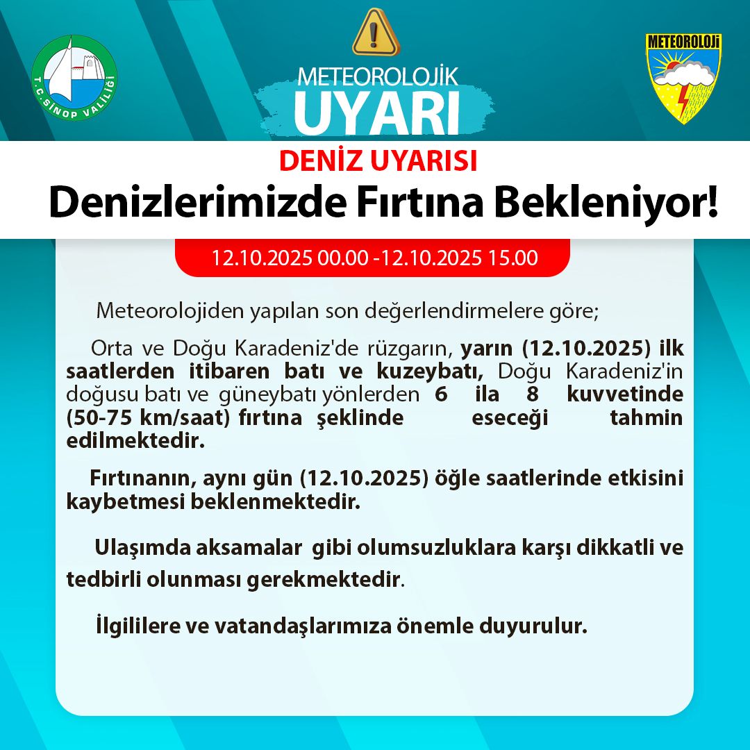 Valilikten yapılan açıklamada, Meteoroloji Genel Müdürlüğü’nün son değerlendirmelerine göre; Orta ve Doğu Karadeniz’de yarın (12 Ekim 2025) sabah saatlerinden itibaren rüzgârın, batı ve kuzeybatı yönlerinden, Doğu Karadeniz’in doğusunda ise batı ve güneybatı yönlerinden 6 ila 8 kuvvetinde (50-75 km/saat) fırtına şeklinde eseceği tahmin edildiği belirtildi. Fırtınanın öğle saatlerine doğru etkisini kaybetmesi beklendiği ifade edildi.