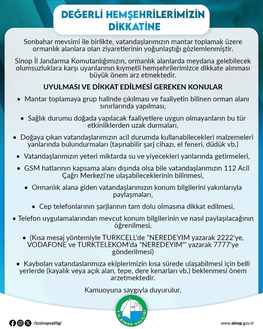 "Mantar toplamaya grup halinde çıkılması ve yalnız başına ormana girilmemesi,