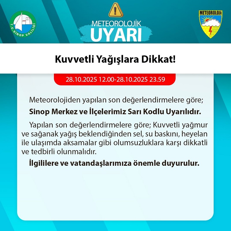 Sinop Valiliği, öğle saatlerinden itibaren Sinop ve tüm ilçelerinde kuvvetli yağış beklendiğini duyurdu. Saat 12.30 sıralarında başlayacağı düşünülen kuvvetli yağışların gece yarısı itibarıyla kenti terk etmesi bekleniyor.