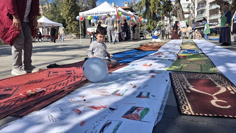 Türkiye’nin 81 ilinde eş zamanlı olarak düzenlenen etkinlik Sinop’ta da renkli anlara sahne oldu. Sinop Uğur Mumcu Meydanı’nda oluşturulan etkinlik alanında toplanan çocuklar, oluşturulan çizim alanında çizdikleri resimlerle Sinop’tan Filistinli akranlarına destek mesajları iletti. Ayrıca yüz boyama ve okçuluk etkinliklerine de yer verildi. Sinop İnsani Yardım Vakfı (İHH) Başkanı Fatih Özcan, İsrail’in Filistin’e yönelik saldırılarını kınayarak şunları söyledi; “Yetim Vakfı ve Sinop İHH iş birliğinde, çocuklarımız burada duygu ve düşüncelerini kağıtlara döküyorlar. İsrail’e olan nefreti kağıda yazıyorlar. Burada Gazze’deki Müslüman kardeşlerimize, tüm boynu bükük kalmış yetimlere, öksüzlere, çocuklara diyoruz ki, biz burada Gazzeli çocukların yanındayız. Çocuklar, kardeşlerini asla yalnız bırakmayacaklarını ifade ediyorlar. Bu etkinliğe katılan tüm Sinoplulara, güzel yürekli çocuklara ve vicdan sahiplerine teşekkür ediyoruz.” Fatih Özcan, gün boyunca 11.00 – 18.00 saatleri arasında devam edecek etkinliğe tüm Sinoplu vatandaşları ve çocukları davet etti.