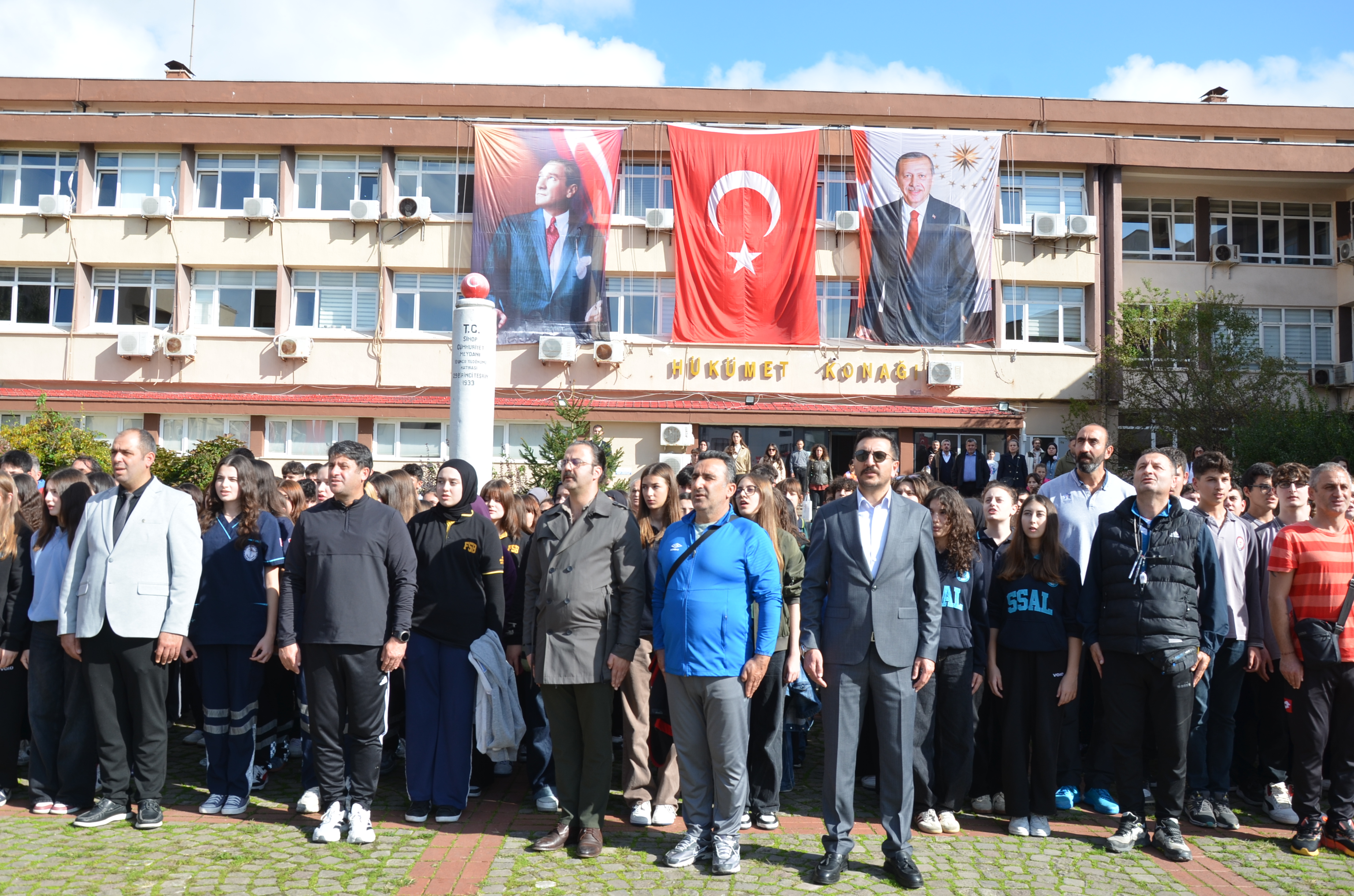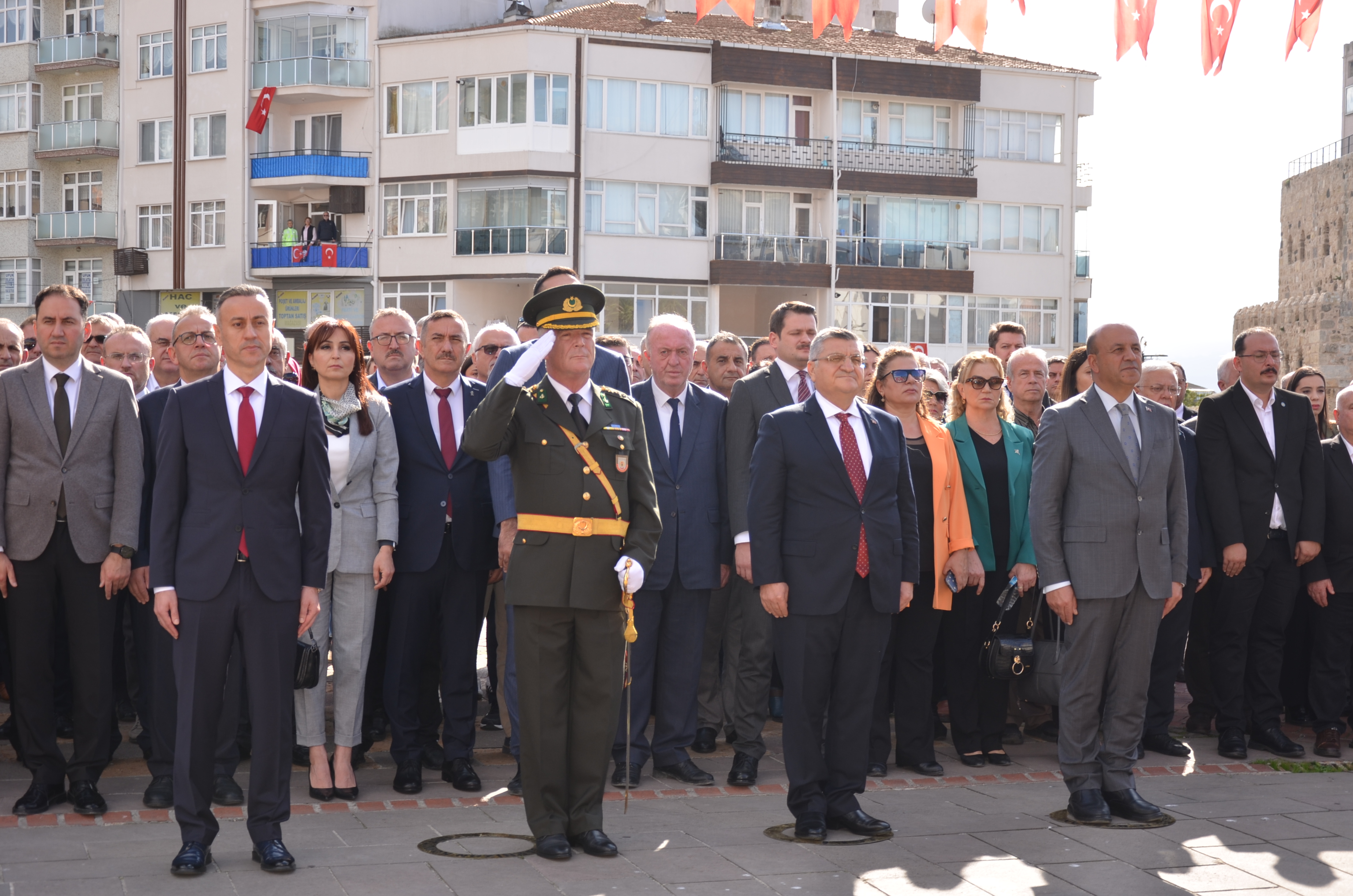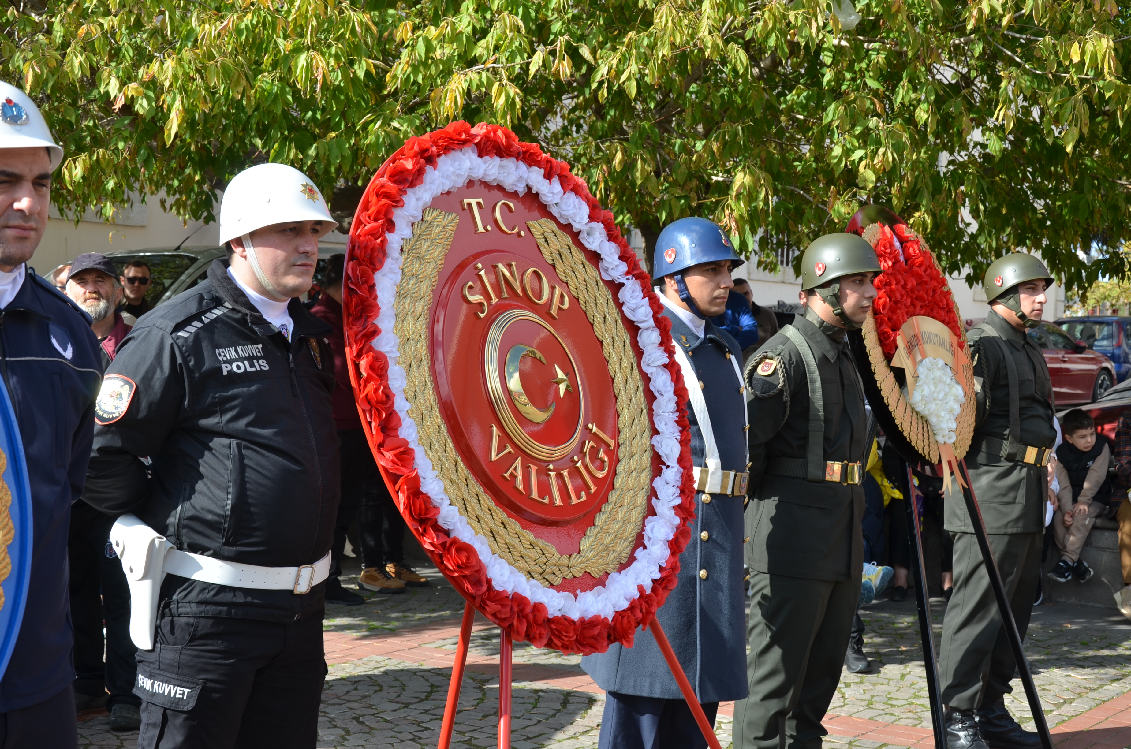Atatürk Anıtı önüne Sinop Valiliği, Sinop Belediyesi ve Garnizon Komutanlığı çelenklerinin sunulmasının ardından saygı duruşunda bulunuldu ve İstiklal Marşı okundu. Türk Bayrağı’nın göndere çekilmesiyle tören sona erdi.