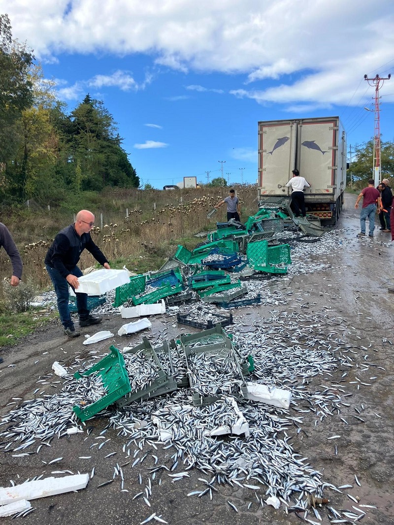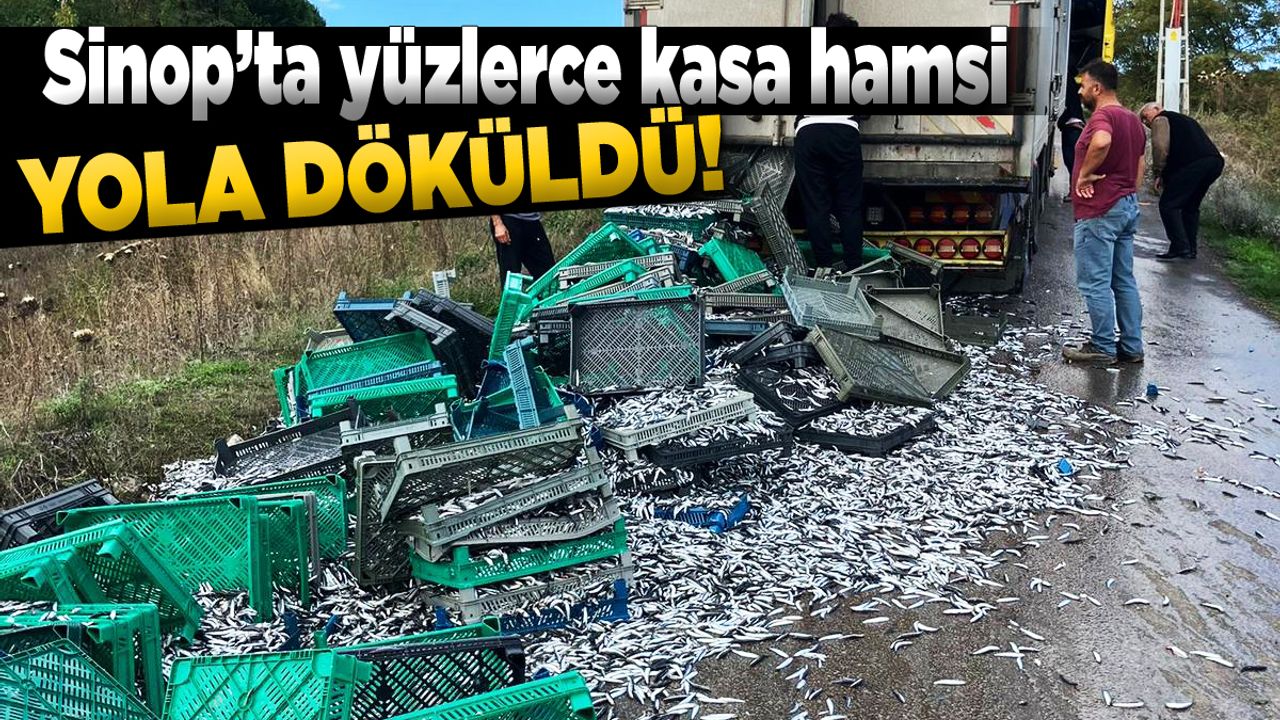 Edinilen bilgilere göre Sinop Demirci Köyü Balıkçı Barınağından kent merkezine hamsi götüren bir kamyondan yola 1200 kasa hamsi döküldü.