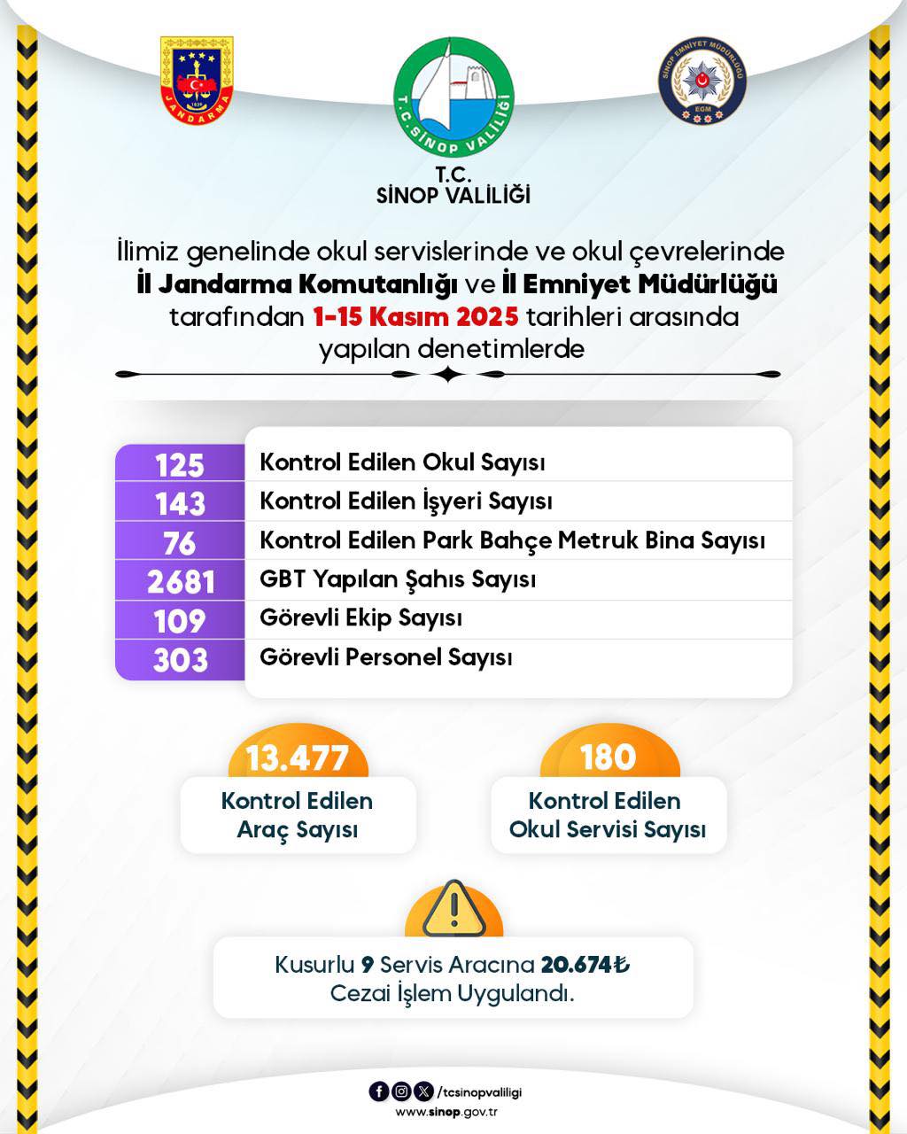 Sinop Valiliği, İl Jandarma Komutanlığı ve İl Emniyet Müdürlüğü ekiplerinin 1–15 Kasım 2025 tarihleri arasında okul servisleri ve okul çevrelerinde gerçekleştirdiği denetim sonuçlarını kamuoyuyla paylaştı.